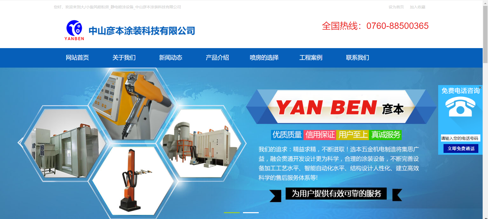 今天讓我們一起來(lái)分享一下粉末涂裝設(shè)備網(wǎng)站建設(shè)案例: 中山彥本涂裝科技有限公司創(chuàng)建于2004年,是一家專(zhuān)業(yè)從事表面粉末涂裝設(shè)備研發(fā),生產(chǎn)及銷(xiāo)售服務(wù)于一體的廠(chǎng)家。彥本專(zhuān)注于研發(fā)生產(chǎn)大小旋風(fēng)噴房系統(tǒng)、立式噴粉線(xiàn)、靜電噴槍、機(jī)器人等智能?chē)娡吭O(shè)備。噴房關(guān)鍵部位元器件全部進(jìn)口,粉末利用率達(dá)到98%,15分鐘左右可以快速換色,完全做到室內(nèi)排放、零污染。