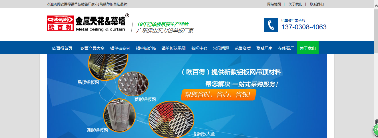 佛山市歐百建材科技有限公司始建于21世紀(jì),位于佛山市南海區(qū)里水鎮(zhèn),(www.lvwangban.cn)。歐百得是集生產(chǎn)、銷售于一體的建材公司,其主要產(chǎn)品有鋁天花和鋁幕墻2大系列,系列包含:鋁板網(wǎng),鋁網(wǎng)板,吊頂鋁網(wǎng)板,吊頂鋁板網(wǎng),沖孔鋁板網(wǎng),圓孔鋁板網(wǎng),金屬網(wǎng)板材料,使歐百建材產(chǎn)品深受全國消費者的信賴,產(chǎn)品暢銷國內(nèi)23個省及市。