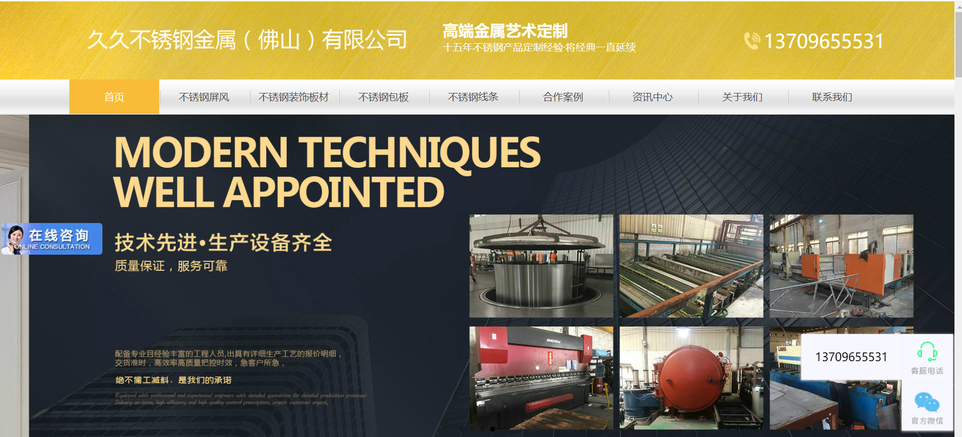 久久不銹鋼(佛山)有限公司位于佛山不銹鋼產(chǎn)業(yè)基地,及不銹鋼產(chǎn)品生產(chǎn)加工,研發(fā)銷售于一體。主要生產(chǎn)和銷售各種材質的不銹鋼裝飾板材,承接各種不銹鋼裝飾工程提供各種安裝解決方案,定制不銹鋼制品、屏風、酒柜,公司配套有精密剪壓刨設備、平板激光機、激光切管機、焊接打磨制品部、真空電鍍設備。